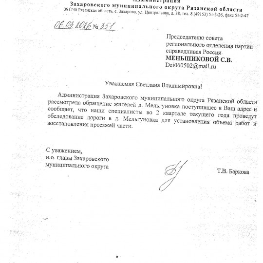 Люди обратились в Региональное отделение партии СПРАВЕДЛИВАЯ РОССИЯ в Рязанской области. В результате мы добились, что во 2 квартале текущего года будет проведено обследование дороги для установления работ и восстановления проезжей части.