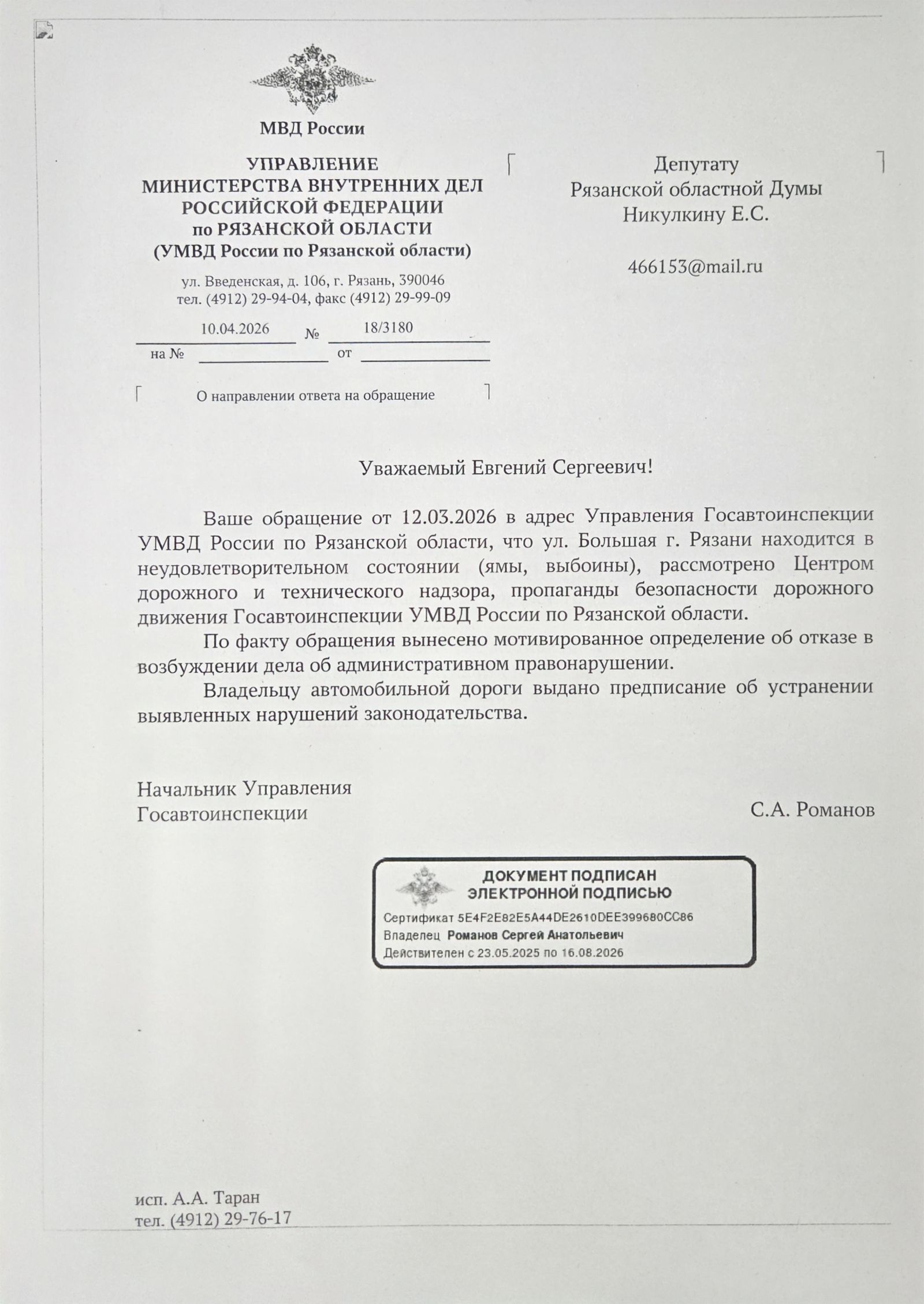 УМВД России по Рязанской области дало ответ. Ддействительно, дорожное полотно находится в неудовлетворительном состоянии.