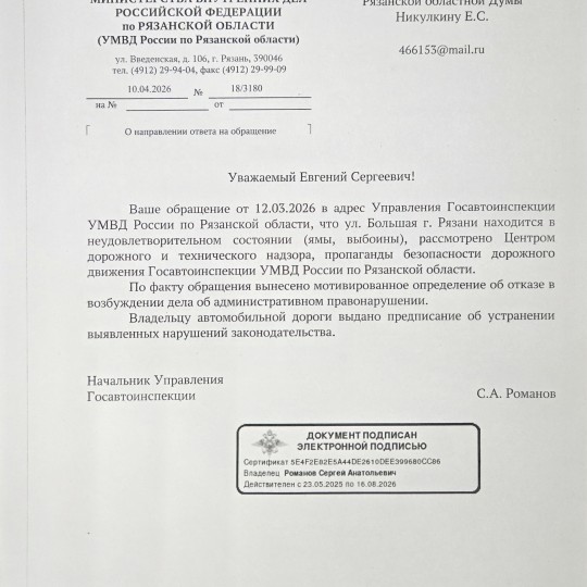 По итогам обращения Евгения Никулкина отремонтируют дорогу на ул. Большая